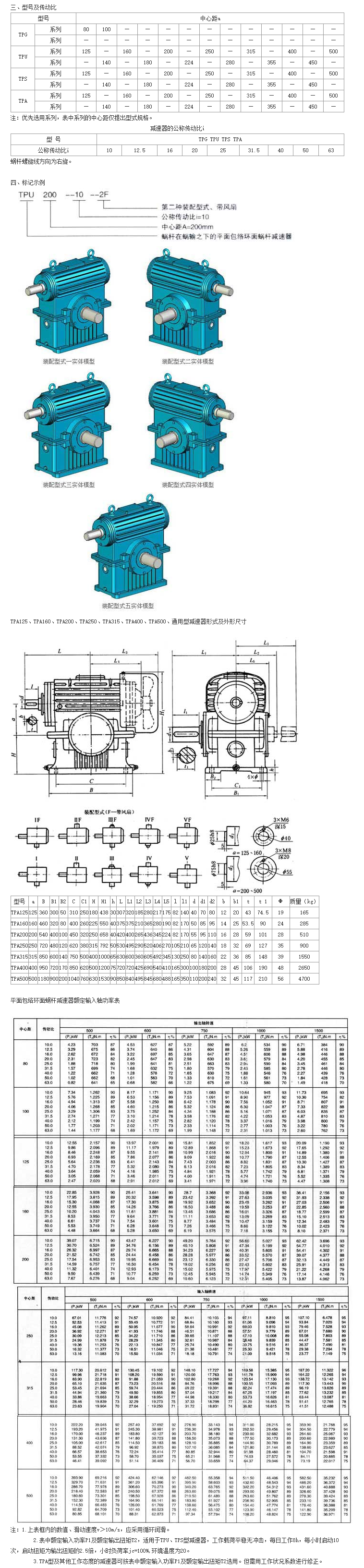 该减速器系列有四种型式:TPG、TPU、TPA、TPS 其中TP-平面包络环面蜗杆组合为